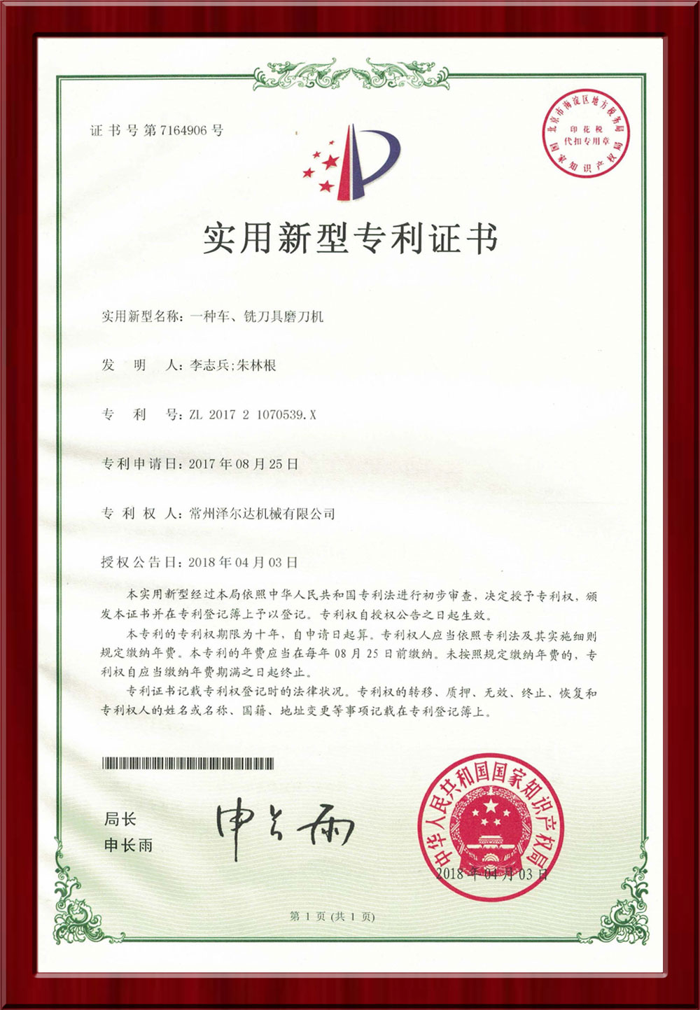 • 7309185實(shí)用新型專利