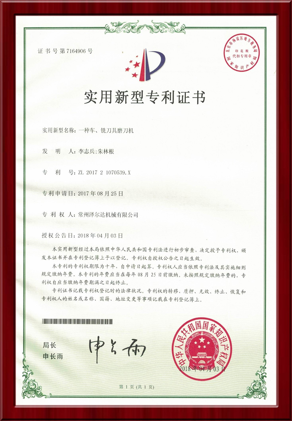 • 7164906實(shí)用新型專利