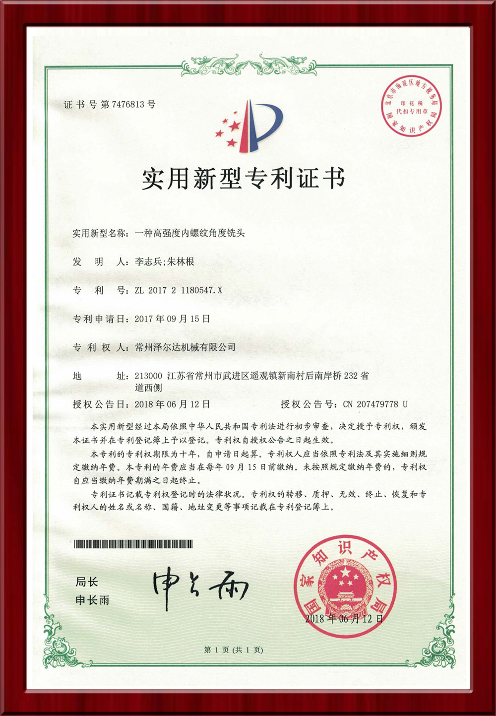 • 7476812實(shí)用新型專利